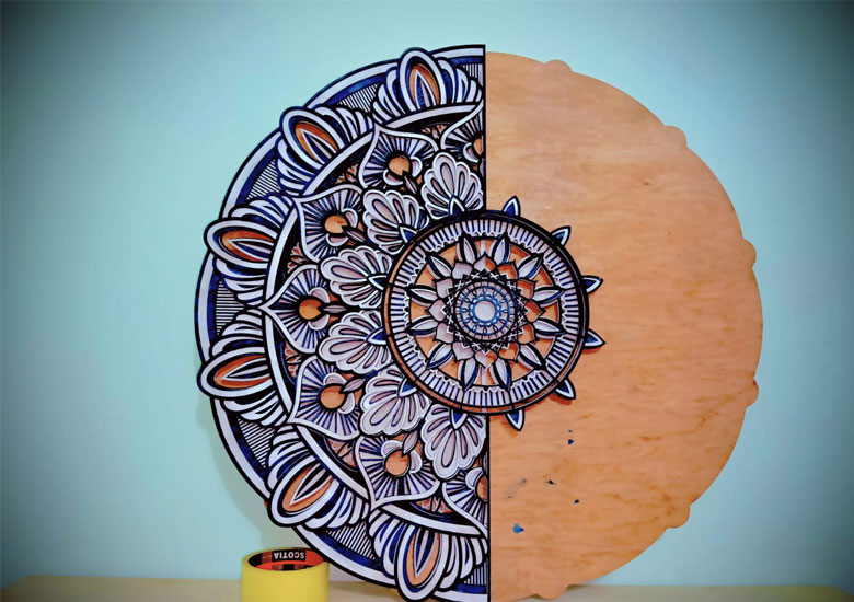 Introducing ‘Eclipse’: a breathtaking 25-inch round wall decor masterpiece. Meticulously handcrafted from 7 layers of 3mm premium plywood, this piece features a stunning artistic inlay on one half and a pristine mirror on the other. This fusion of intricate craftsmanship and functional design creates a bold, modern statement for any room in your home.