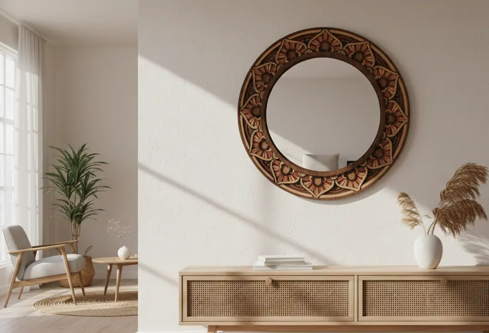 A beautifully handcrafted 7-layer premium veneer wood mirror, featuring elegant floral detailing and a 56×56 cm round design. Includes a high-clarity 3mm mirror—perfect for modern, classic, or artistic interiors.
