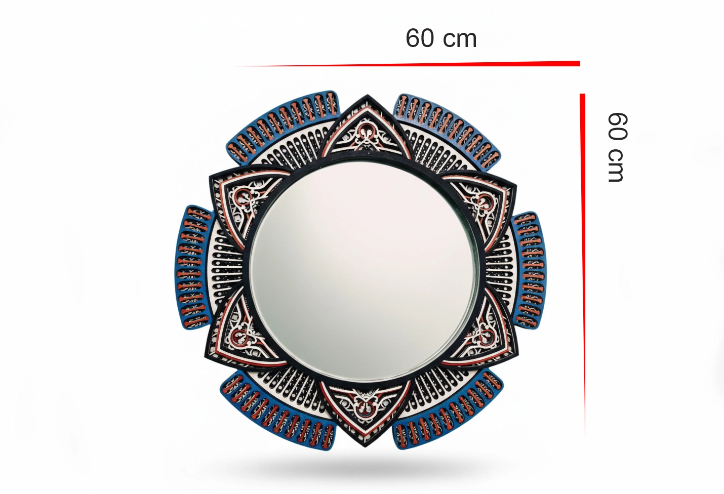Inspired by the energy of the sun (“Sol”), Solara reflects warmth and vitality through its layered wooden petals and circular mirror core. The subtle blend of blue, red, and natural tones creates a soothing yet vibrant aura that complements both modern and traditional interiors.
